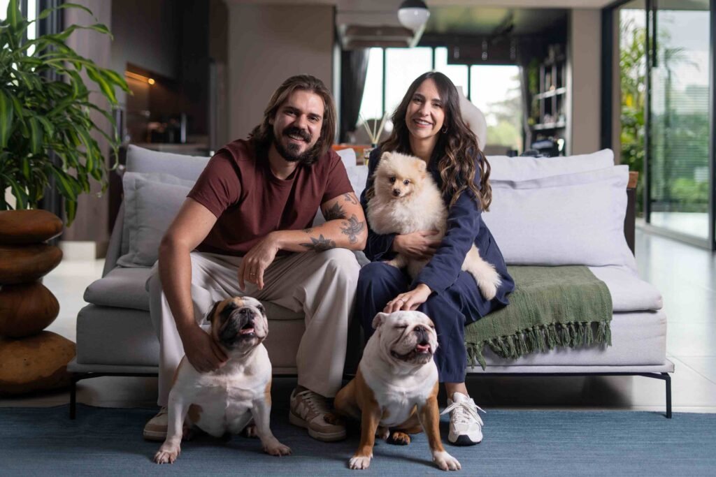 Léo – Controlamos muito bem a alimentação deles. Pesamos todas as porções. Damos comida de manhã e à noite e, eventualmente, petiscos e brincadeiras ao longo do dia. Mantemos a mesma quantidade de alimento, independentemente da época do ano, dosando conforme a necessidade de cada um e também de acordo com a idade e o nível de atividade. Por exemplo, temos o bulldog Afonso, que tem apenas 1 ano e é extremamente ativo. Então, ele come mais porque queima muita caloria. Já a Madalena é uma bulldog mais velha, faz menos atividades. A alimentação dela é controlada de forma bem rígida. A Lola, nossa gata, se autorregula. Ela tem comedouros interativos e vai comendo no tempo dela. O que controlamos mais é o sachê, que oferecemos diariamente, principalmente por conta da hidratação, já que gatos costumam beber menos água do que deveriam. Ela é viciada em sachê, se dermos cinco por dia, ela come. Por isso, controlamos com orientação veterinária de acordo com o peso dela. Visualmente também conseguimos identificar se algum dos cachorros está acima ou abaixo do peso, mas todos são muito saudáveis nesse sentido, até pela combinação com atividades físicas.